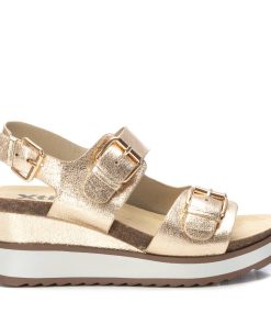 Sandalia de mujer, de la marca Xti. Fabricada en material que imita la piel acabado metalizado. Diseño de doble pala con hebillas metalizadas. Planta bio. Correa al tobillo para mayor sujeción. Suela gruesa de 5 cm de goma antideslizante. Este modelo ha obtenido el certificado vegano por la organización mundial PETA (Organización de los derechos de los animales).