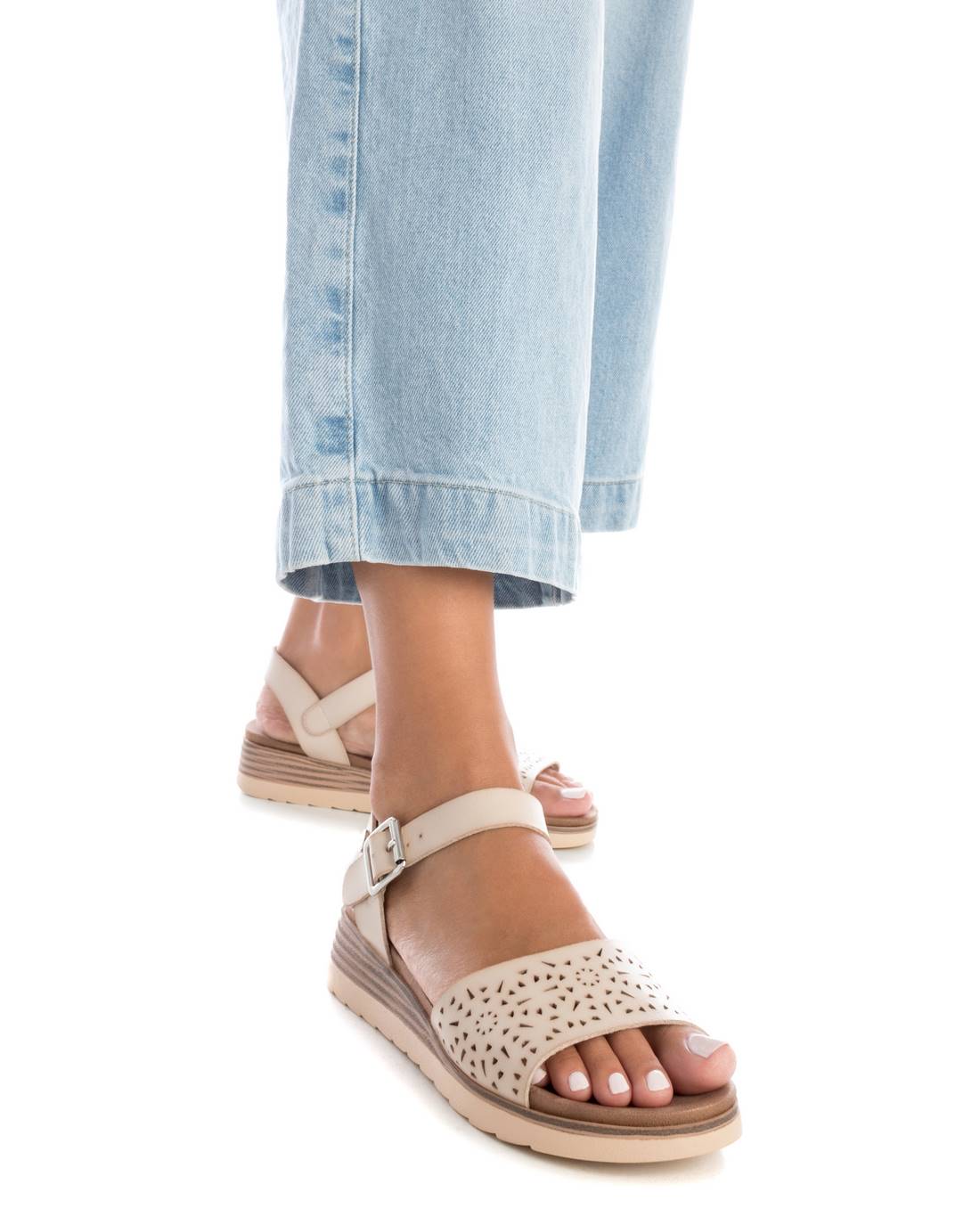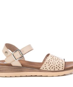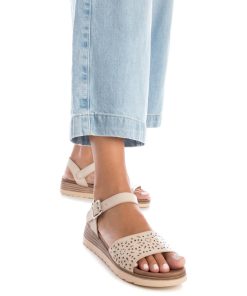 Sandalia de mujer, de la marca Xti. Fabricada en material que imita la piel. Diseño de pala con troquelado, ideal para complementar tus looks. Cierre con hebilla para facilitar el ajuste. Pequeña cuña de 4 cm y suela de goma antideslizante. Este modelo ha obtenido el certificado vegano por la organización mundial PETA (Organización de los derechos de los animales).