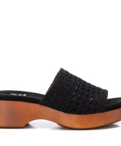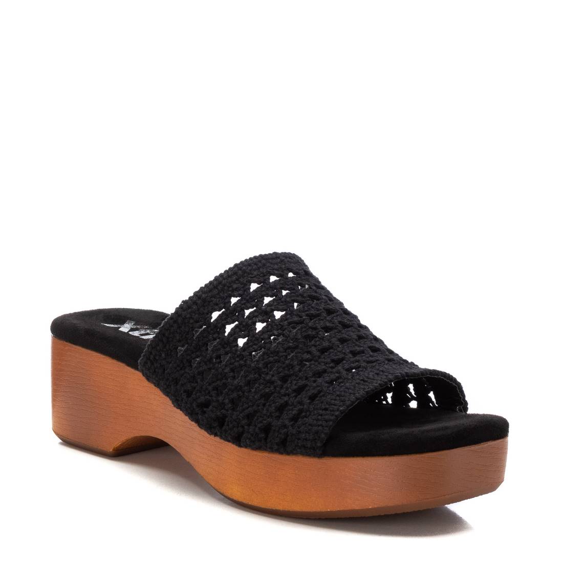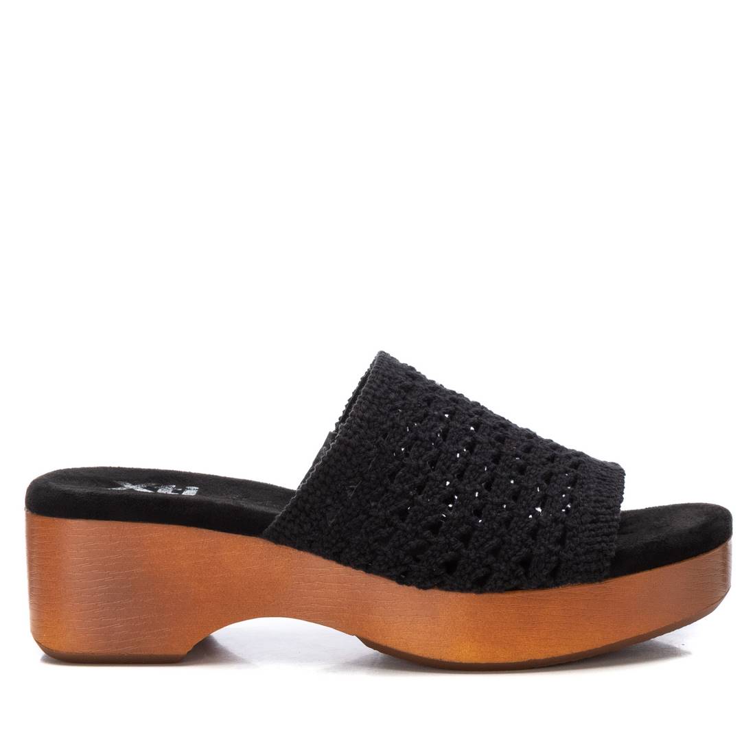 Sandalia de mujer, de la marca Xti. Fabricada en material textil tipo crochet. Diseño tipo pala. Tacón con plataforma madera y suela de goma antideslizante. Este modelo ha obtenido el certificado vegano por la organización mundial PETA (Organización de los derechos de los animales).
