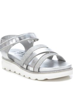 Sandalia de niña, de la marca Xti Kids. Fabricada en material metalizado que imita la piel. Cierre mediante tira adherente. Cómoda planta metalizada con gruesa suela canalada de goma antideslizante. Este modelo ha obtenido el certificado vegano por la organización mundial PETA (Organización de los derechos de los animales).