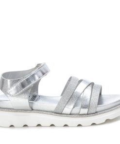 Sandalia de niña, de la marca Xti Kids. Fabricada en material metalizado que imita la piel. Cierre mediante tira adherente. Cómoda planta metalizada con gruesa suela canalada de goma antideslizante. Este modelo ha obtenido el certificado vegano por la organización mundial PETA (Organización de los derechos de los animales).
