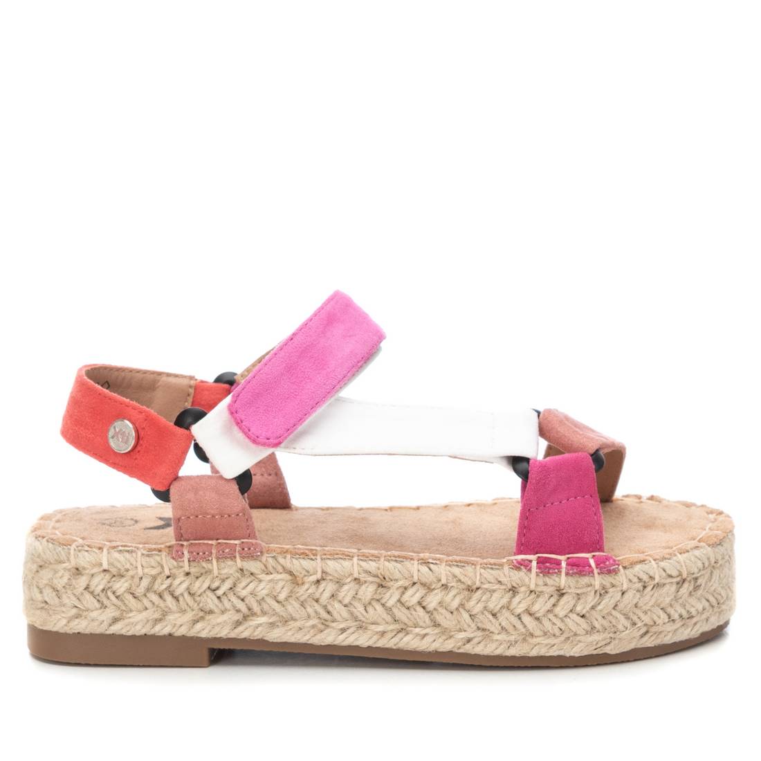 Sandalia multicolor de niña, de la marca Xti Kids. Fabricada en suave antelina. Cierre mediante tira adherente. Plataforma rodeada por tiras de yute con suela de goma antideslizante. Una sandalia ideal para completar los looks más veraniegos esta temporada. Este modelo ha obtenido el certificado vegano por la organización mundial PETA (Organización de los derechos de los animales).