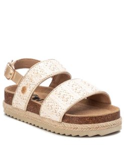 Sandalia de niña, de la marca Xti Kids. Formada por dos tiras de rafia. Bordes en material metalizado que imita la piel a juego de la tira trasera con hebilla metalizada para ajustar el tobillo. Cómoda planta bios en serraje. Esta sandalia será un imprescindible para completar todos los looks esta temporada. Piso decorado por tira de yute con suela canalada de goma antideslizante.