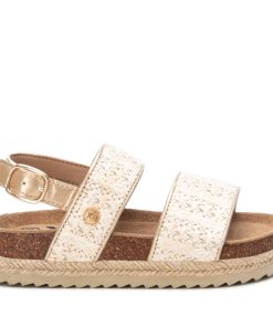 Sandalia de niña, de la marca Xti Kids. Formada por dos tiras de rafia. Bordes en material metalizado que imita la piel a juego de la tira trasera con hebilla metalizada para ajustar el tobillo. Cómoda planta bios en serraje. Esta sandalia será un imprescindible para completar todos los looks esta temporada. Piso decorado por tira de yute con suela canalada de goma antideslizante.