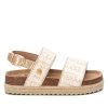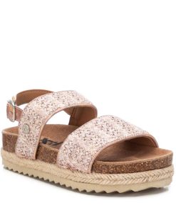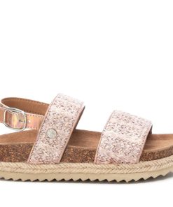 Sandalia de niña, de la marca Xti Kids. Formada por dos tiras de rafia. Bordes en material metalizado que imita la piel a juego de la tira trasera con hebilla metalizada para ajustar el tobillo. Cómoda planta bios en serraje. Esta sandalia será un imprescindible para completar todos los looks esta temporada. Piso decorado por tira de yute con suela canalada de goma antideslizante.