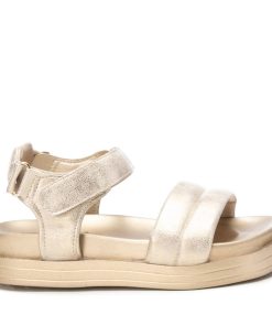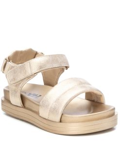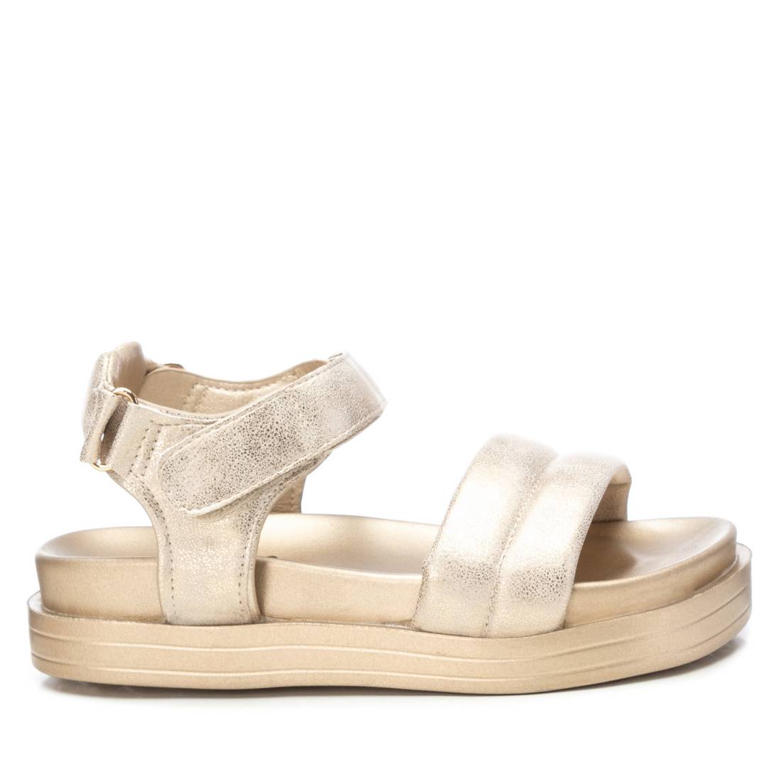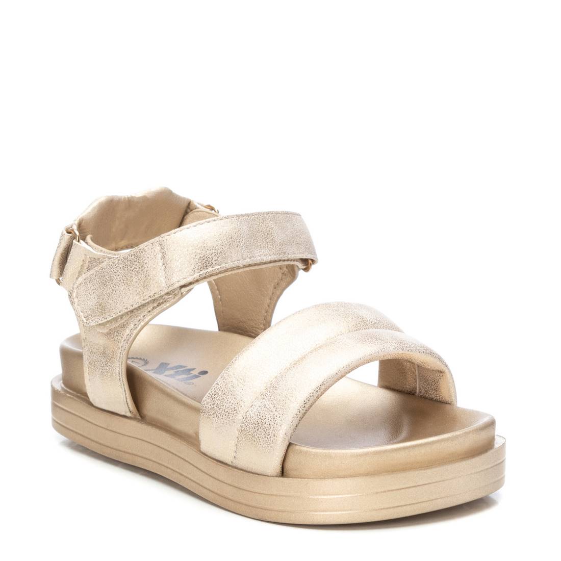 Sandalia de niña, de la marca Xti Kids. Fabricada en material metalizado que imita la piel. Pala ligeramente acolchada con pespunte al tono. Pulsera trasera con cierre adherente para sujetar el tobillo. Gruesa plataforma con suela de goma antideslizante. Este modelo ha obtenido el certificado vegano por la organización mundial PETA (Organización de los derechos de los animales).
