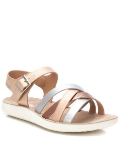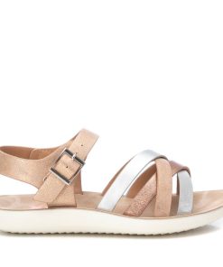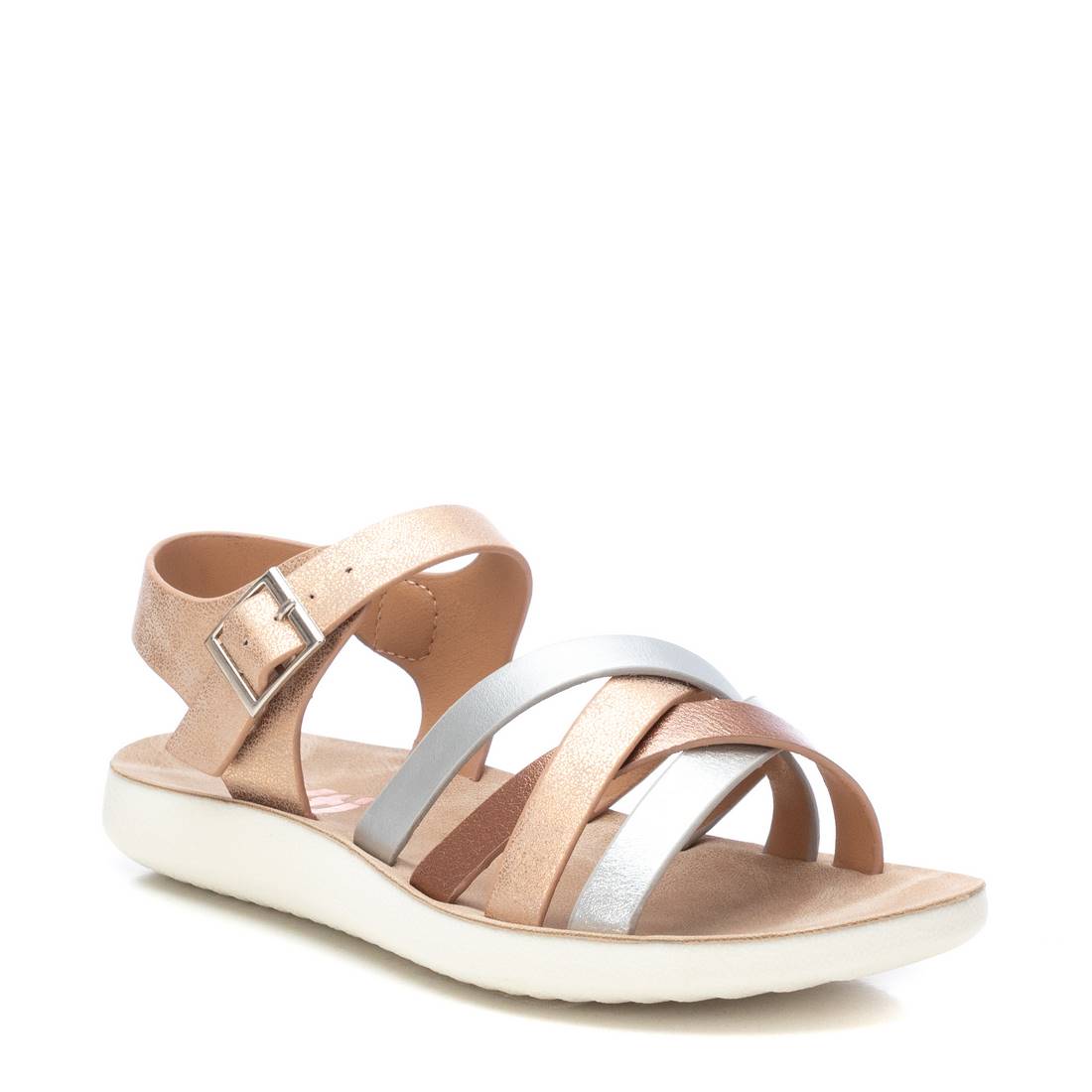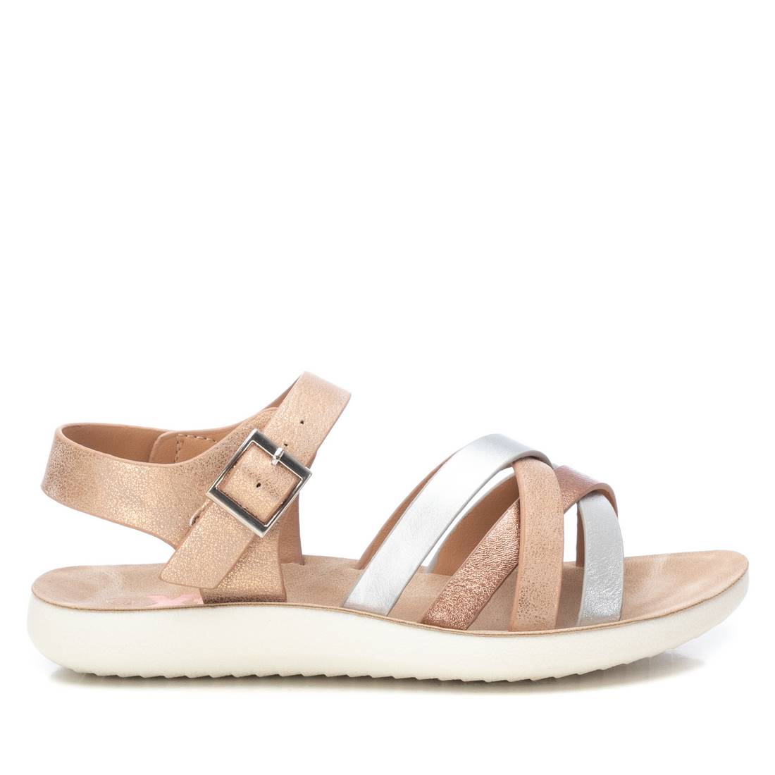 Sandalia de niña, de la marca Xti Kids. Fabricada en cómodo material metalizado que imita a la piel. Cierre mediante hebilla con tira que ajusta el tobillo. Cómoda planta al tono con suela de 2 cm de goma antideslizante. Este modelo ha obtenido el certificado vegano por la organización mundial PETA (Organización de los derechos de los animales).