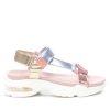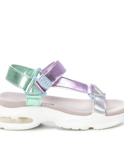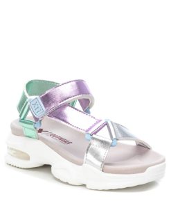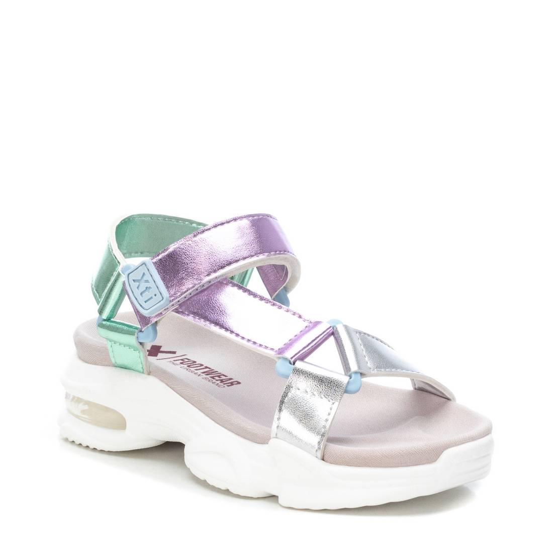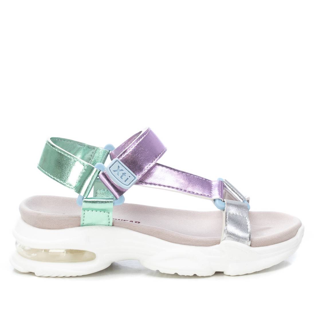 Sandalia de niña, de la marca Xti kids. Fabricada en cómodo material metalizado que imita a la piel. Tiras autoadherentes para sujetar el tobillo. Cómoda planta textil con gruesa suela de goma con cámara de aire. Este modelo ha obtenido el certificado vegano por la organización mundial PETA (Organización de los derechos de los animales).