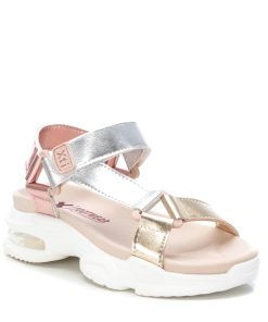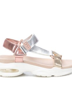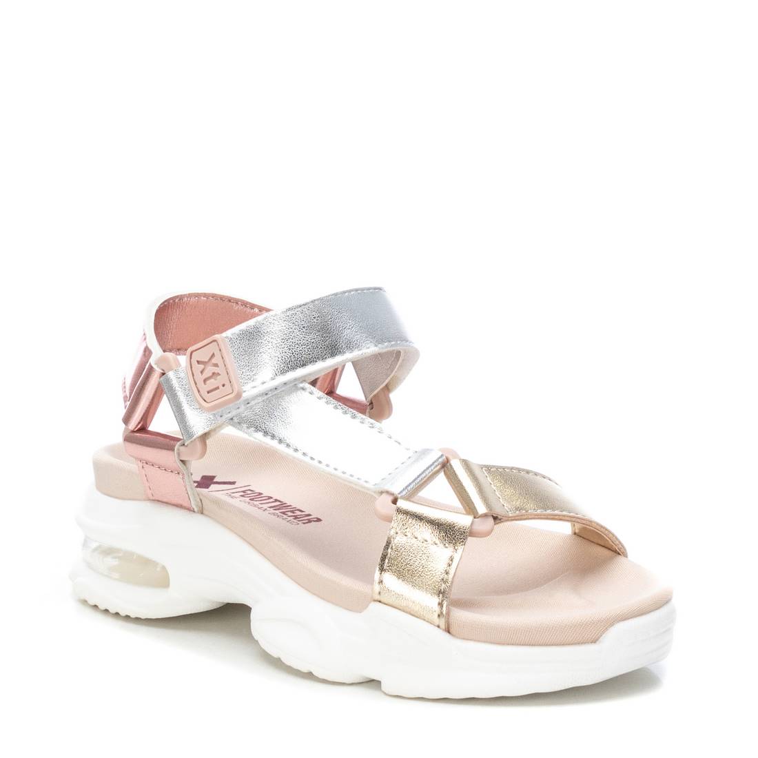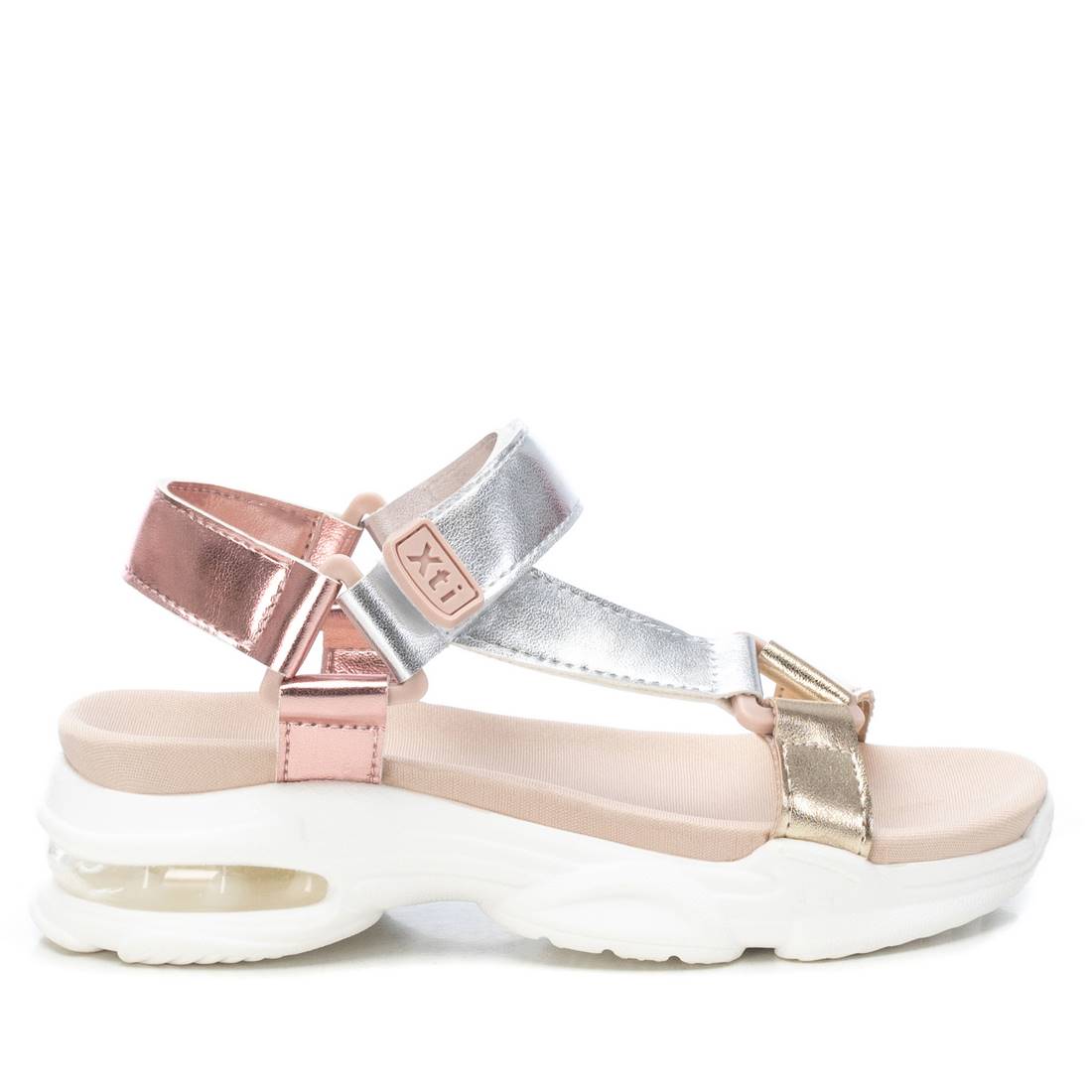 Sandalia de niña, de la marca Xti kids. Fabricada en cómodo material metalizado que imita a la piel. Tiras autoadherentes para sujetar el tobillo. Cómoda planta textil con gruesa suela de goma con cámara de aire. Este modelo ha obtenido el certificado vegano por la organización mundial PETA (Organización de los derechos de los animales).