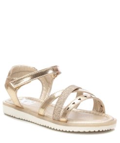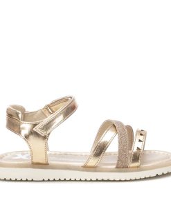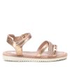 Sandalia de niña, de la marca Xti Kids. Fabricada en material metalizado que imita a la piel. Pala compuesta por tres tiras con diferentes acabados. Pulsera trasera con cierre autoadherente para sujetar el tobillo. Este modelo ha obtenido el certificado vegano por la organización mundial PETA (Organización de los derechos de los animales).
