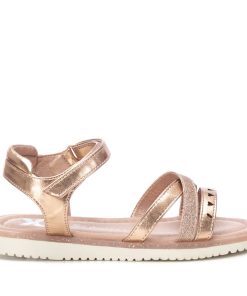 Sandalia de niña, de la marca Xti Kids. Fabricada en material metalizado que imita a la piel. Pala compuesta por tres tiras con diferentes acabados. Pulsera trasera con cierre autoadherente para sujetar el tobillo. Este modelo ha obtenido el certificado vegano por la organización mundial PETA (Organización de los derechos de los animales).