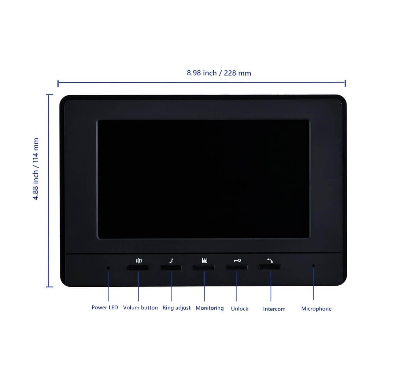 - 7 características principales: pantalla LCD de 7 pulgadas; 16 tipos diferentes de campanillas de puerta; volumen, brillo y contraste son ajustables; cámara IR con visión nocturna; función de control de bloqueo eléctrico; intercomunicador manos libres; apagado automático.