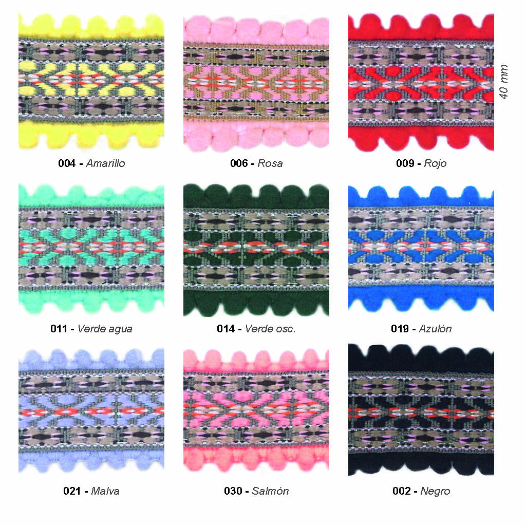 | Color | 002 / NEGRO, 004 / AMARILLO, 006 / ROSA, 009 / ROJO, 011 / VERDE AGUA, 014 / VERDE OSCURO, 019 / AZULÓN, 021 / MALVA, 030 / SALMÓN |