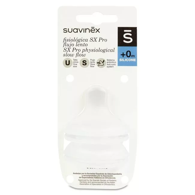Tetina Fisiologica Flujo L de Suavinex. Boca ancha de silicona. 2 unidades. Válvulas anticólico.