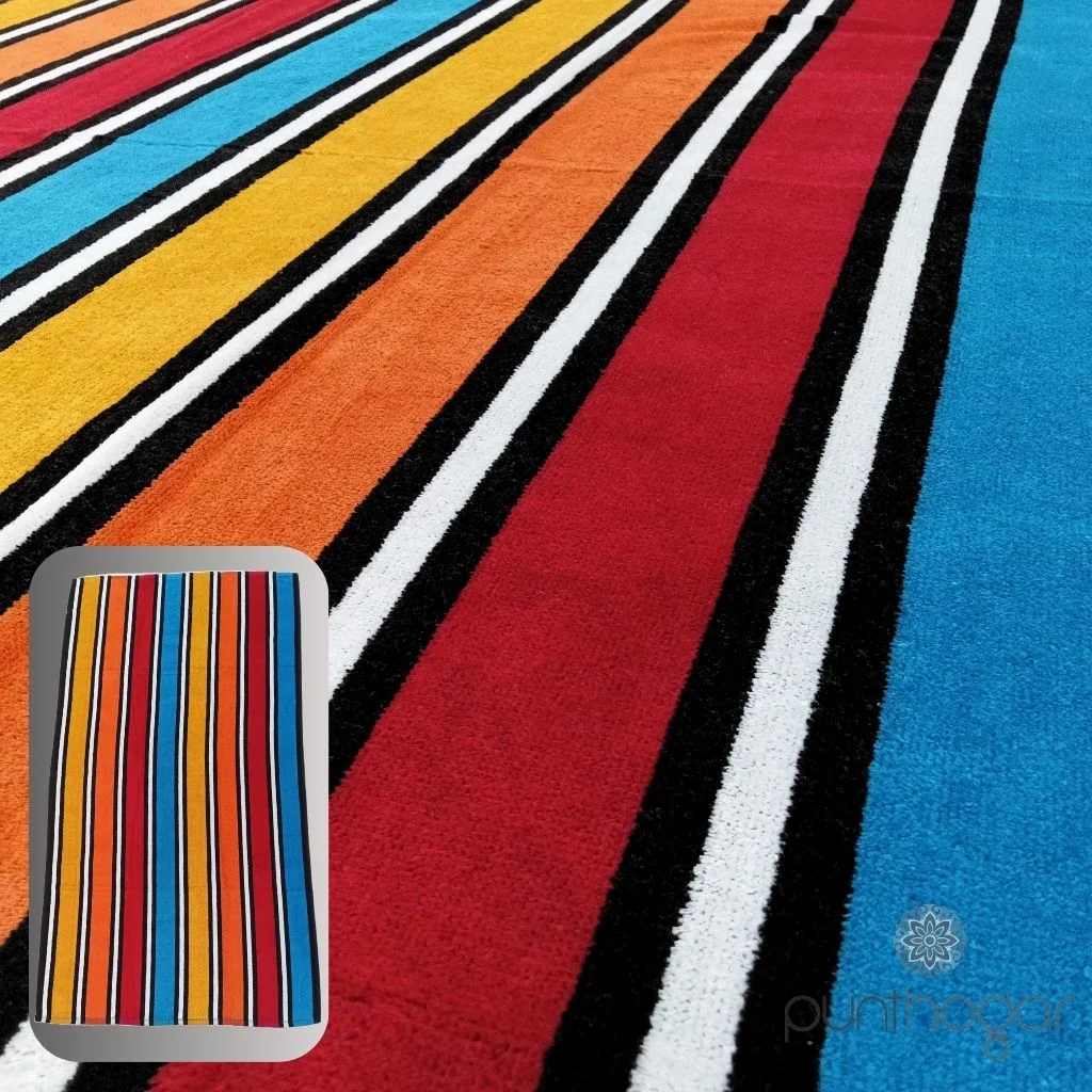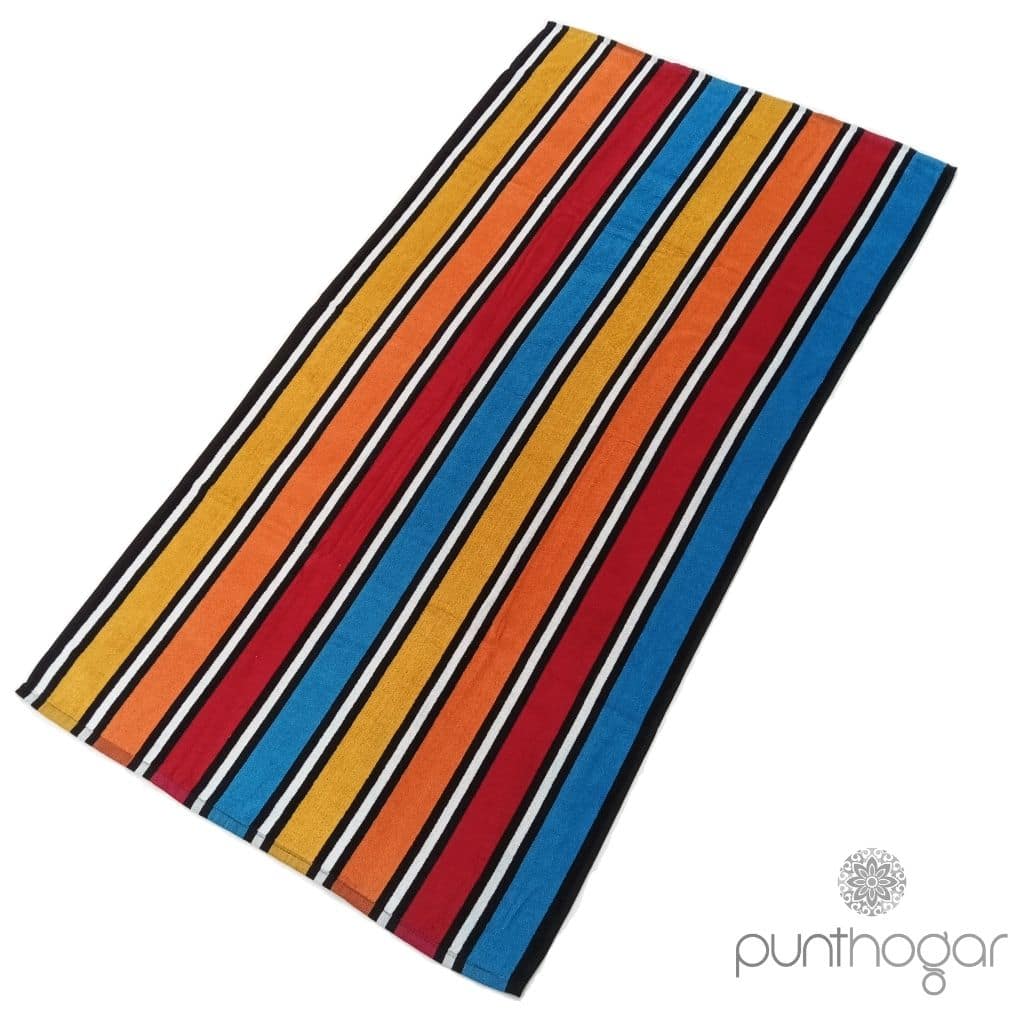 Gran toalla de playa algodón 100% de tejido suave y de alta absorción con diseño listado, para cautivar y presumir de toalla en la playa o piscina esta temporada. Es una toalla para el verano que te secará muy bien después de tu baño debido a su tejido natural.