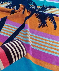 Disfruta del verano con esta toalla de playa de diseño único. Presenta una silueta de palmeras sobre un fondo de rayas horizontales en tonos vibrantes. Ideal para relajarte en la arena, secarte después de un baño o como accesorio de viaje. Su tejido suave y absorbente te brindará comodidad, mientras que su estilo tropical te hará destacar. Perfecta para quienes buscan un toque de originalidad y frescura en sus días de sol. Confeccionada con 100% algodón egipcio, esta toalla es reconocida por su suavidad incomparable y su alta capacidad de absorción. La técnica de tejido Jacquard asegura que el diseño tropical de palmeras se integre de manera duradera en la tela.