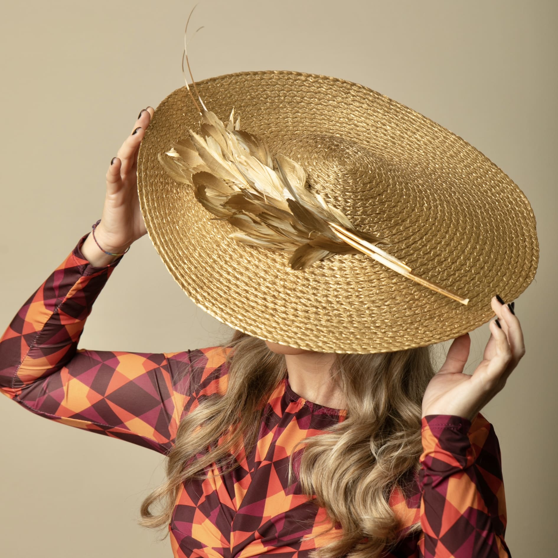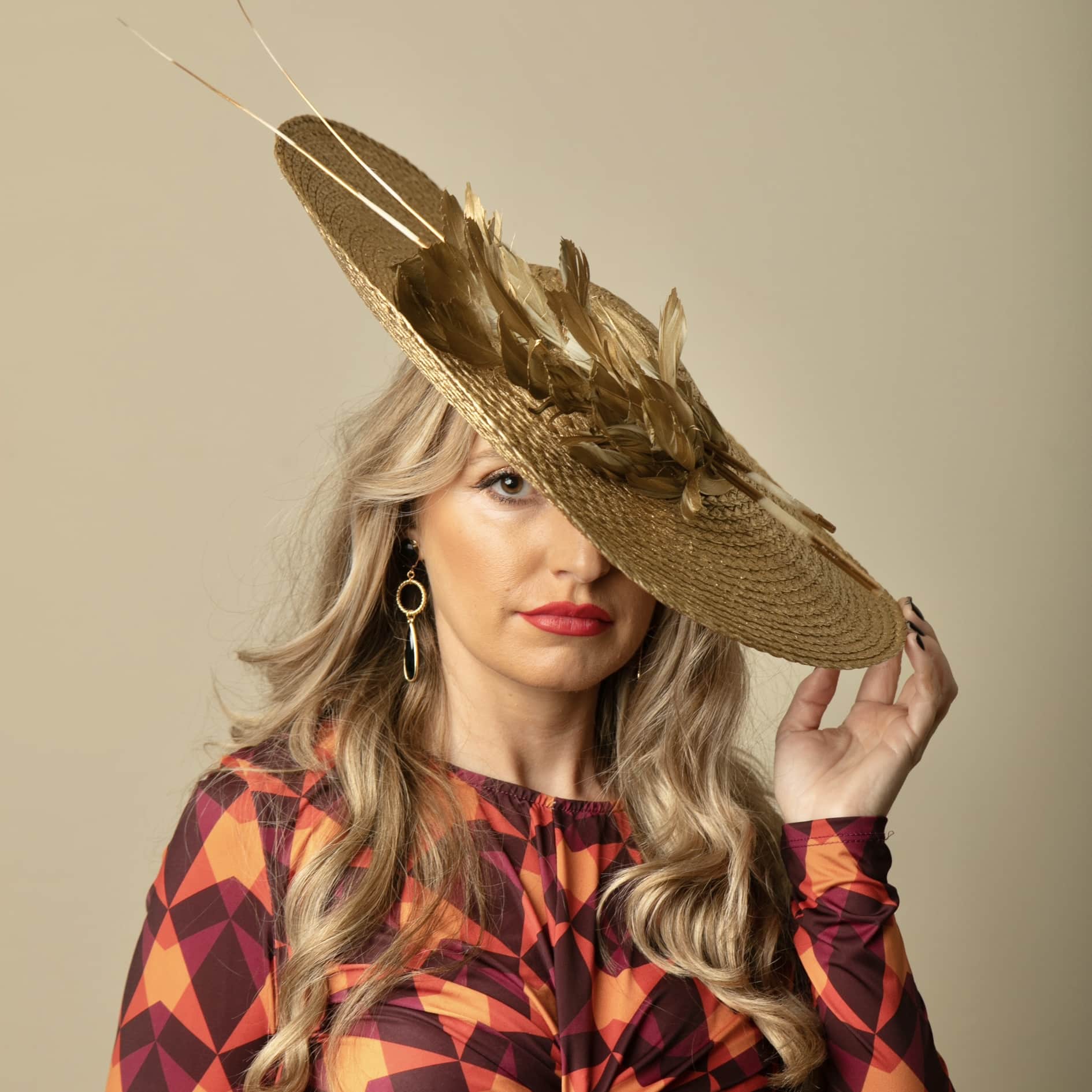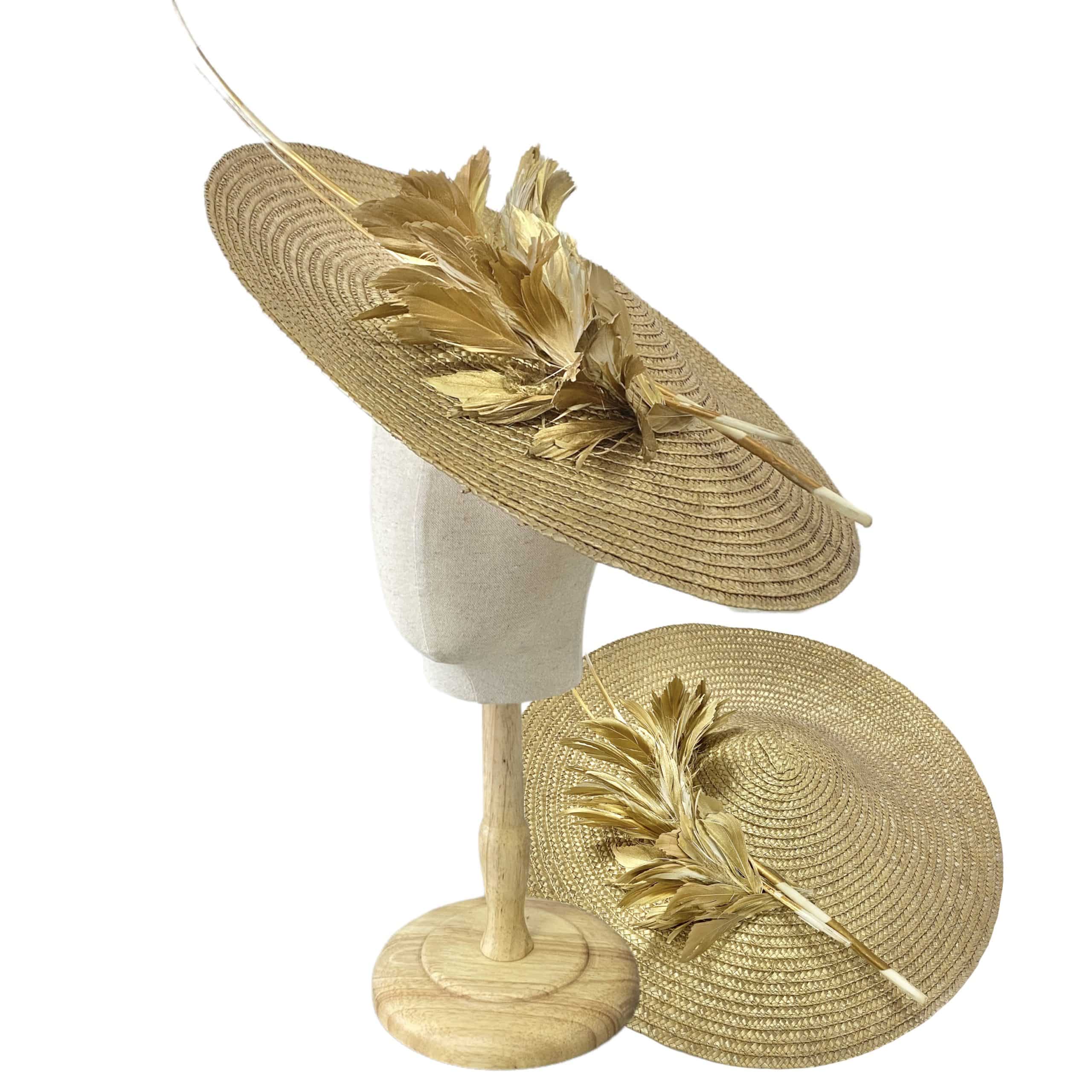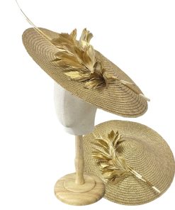 Tocado elaborada 100% a mano en nuestro taller, en color light dorado adornado con plumas en el mismo tono.