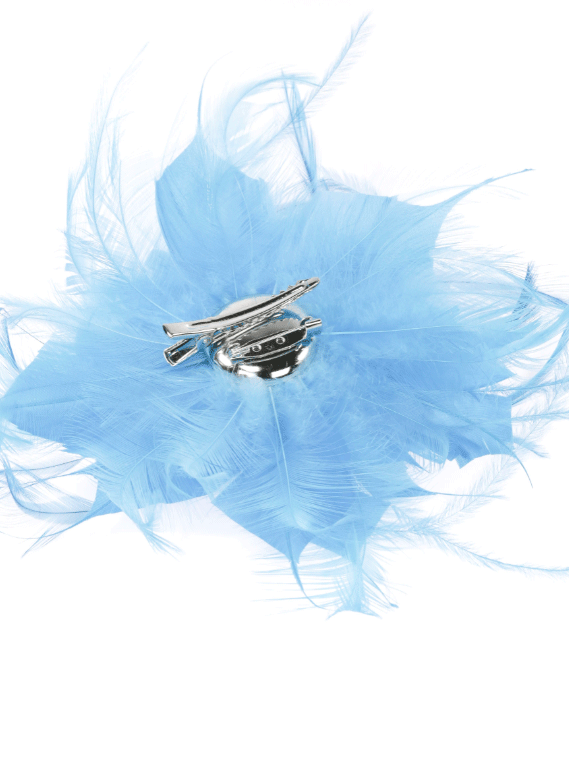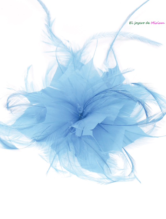 R03/5438 – Tocado pequeño de bodas en color AZUL CIELO, sencillo y elegante a la vez, con el diseño en forma de flor con los pétalos abiertos decorados con finas y delicadas plumitas vaporosas dando originalidad y movimiento a este precioso accesorio para su vestido de fiesta o noche. Además, lleva una pinza e imperdible para que pueda ponerlo tanto en el cabello como en una prenda de vestir a modo de broche.