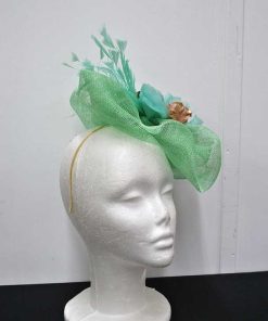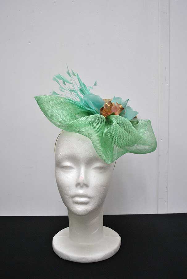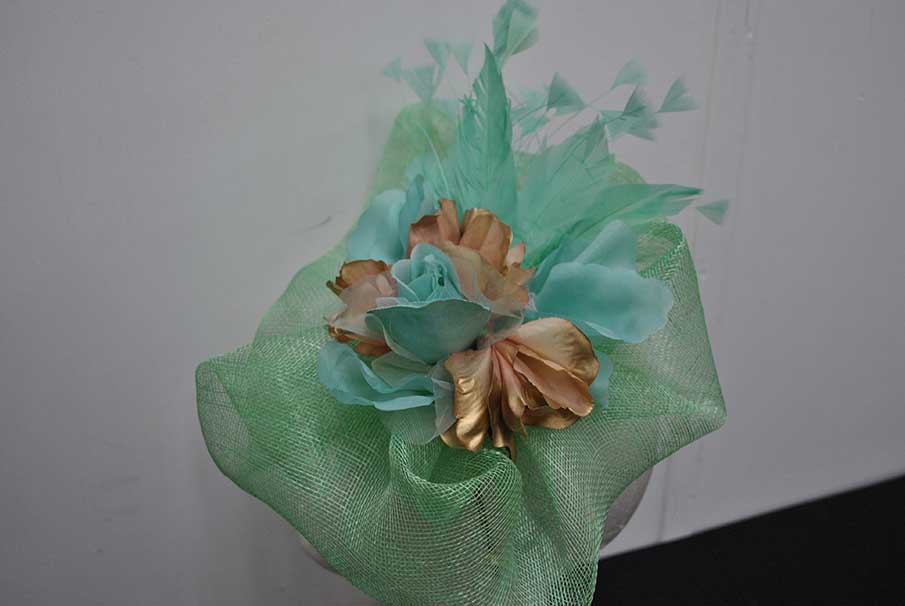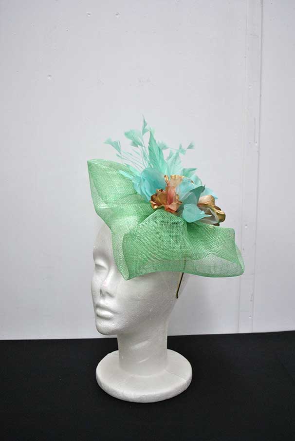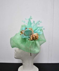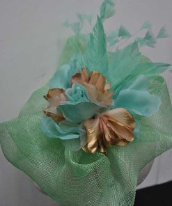 Maravilloso tocado de fiesta, ideal para que luzcas como la invitada o la madrina perfecta. Se trata de un tocado fabricado con la base en sinamay verde agua y con un original diseño formando ondulaciones que quedan estupendas y muy favorecedoras al rostro. Está decorado a mano a base de pétalos de flores dorados y combinados en verde agua, además de vaporosas y elegantes plumas. Lo puedes llevar sujeto cómodamente gracias a la diadema o al juego de horquillas que incluye.