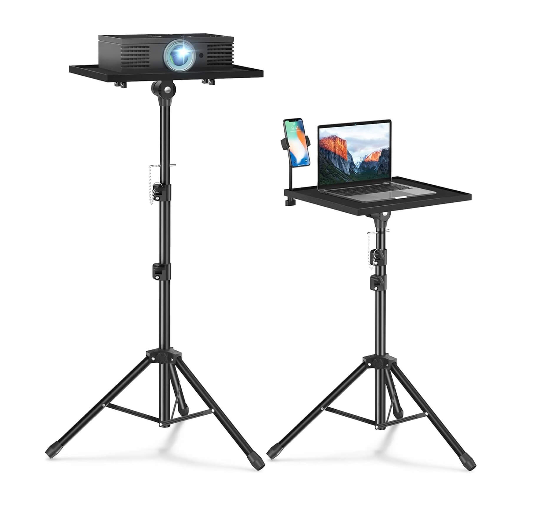 - Trípode ajustable en altura para proyector: La altura del soporte de piso para computadora portátil se puede ajustar de 36 pulgadas a 46 pulgadas. Además, nuestra gran bandeja de metal se adapta a la mayoría de proyectores y portátiles