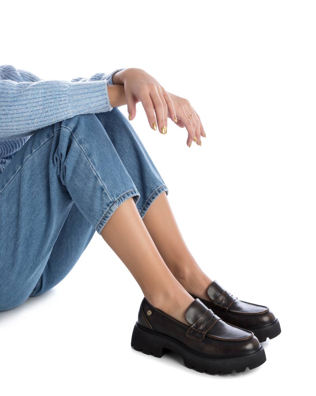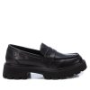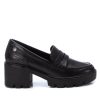 Mocasín de mujer, de la marca Xti. Fabricado en un material que imita la piel. Tacón ancho de 5 cm con suela dentada de goma antideslizante. Un básico de armario. Este modelo ha obtenido el certificado vegano por la organización mundial PETA (Organización de los derechos de los animales).