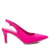 Zapato de mujer, de la marca Xti Basic. Fabricado en tejido. Elegante punta afilada con diseño destalonado y cierre mediante hebilla. Tacón fino de 2 cm y suela de goma antideslizante. Este modelo ha obtenido el certificado vegano por la organización mundial PETA (Organización de los derechos de los animales).