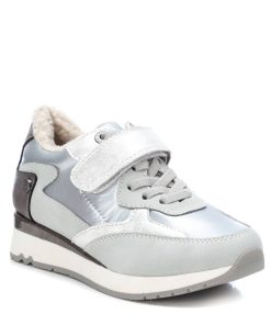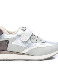Zapatilla de niña, de la marca Xti Kids. Fabricada en textil metalizado combinado en material que imita a la piel. Cierre mediante tira autoadherente con cordones elásticos decorativos. Zapatilla para los días más frios gracias a su confortable forro y suela aislante de goma antideslizante. Este modelo ha obtenido el certificado vegano por la organización mundial PETA (Organización de los derechos de los animales).