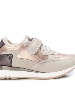 Zapatilla de niña, de la marca Xti Kids. Fabricada en textil metalizado combinado en material que imita a la piel. Cierre mediante tira autoadherente con cordones elásticos decorativos. Zapatilla para los días más frios gracias a su confortable forro y suela aislante de goma antideslizante. Este modelo ha obtenido el certificado vegano por la organización mundial PETA (Organización de los derechos de los animales).